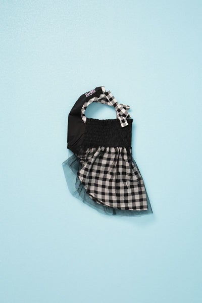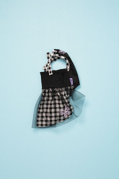 ショルダーリボンギンガムチェックギャザーワンピ BLACK