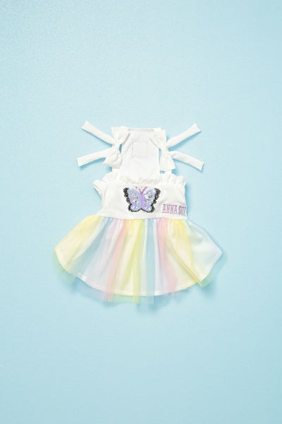 背中側のシャーリングは大人顔負けなデザイン。スカートの蝶の刺繍がオシャレ度アップ!