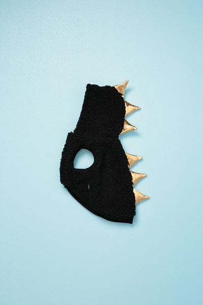 モコモコボア素材のフード付きベスト。ブラックにはゴールド、ライムにはシルバーの背びれが生えた怪獣仕様。暖かさとカッコよさを兼ね備えた注目度の高いアウターに仕上げました。