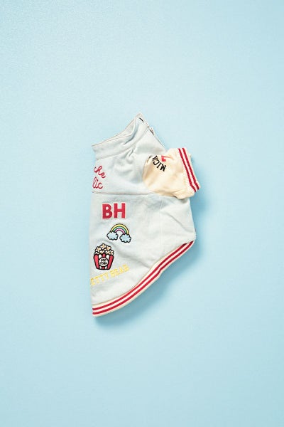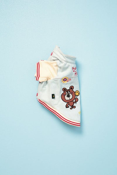 デニム風の素材にたくさんのポップな刺繍入り。袖口や裾のリブに入った2本のラインでスポーティーな雰囲気を出しつつも首回りはあえてチビ襟をつけました。もちろん襟にも刺繍入り。