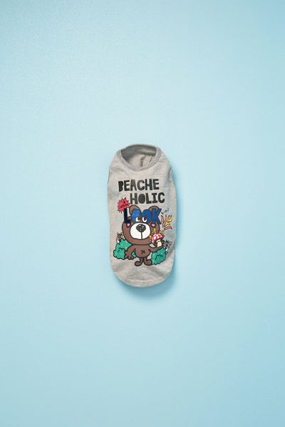 キッチュなイラストが可愛いタンクトップ。「LOOK」の部分の青箔プリントと「ヒーハー!!」がポイント。