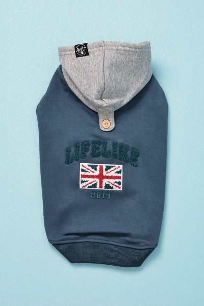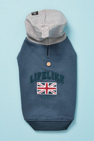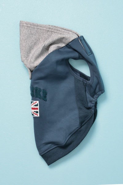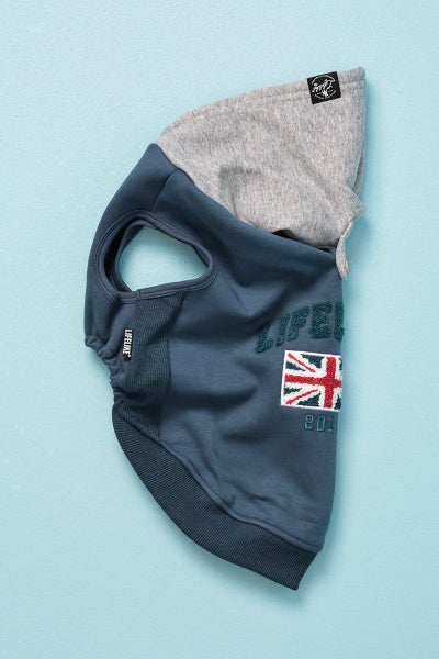 グレーのフード裾にあしらったブラックのオリジナル織ネームが、さりげないアクセントに。フード留めがついているので、着用中にフードが前にかぶる心配もありません。