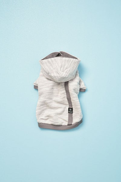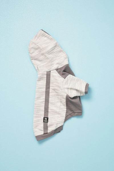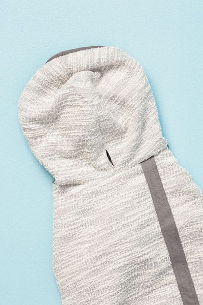 お腹側にはハリがあり、サラッとした手触りの非常にストレッチ性に優れた素材を使用しています。どちらの素材もストレッチ性がかなりありますので全体的に良く伸び、着脱がしやすい商品になっています。また、フードの付け根部分にはリード通し用のホールが開いています。