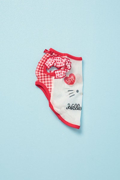 背中には可愛いキティちゃんのフェイスデザインを、どーんとプリント?前身頃はメッシュ生地で、バインダーと同じカラーのチェック柄。胸元にはサテンのリボン付き。そして腕には布帛のチェック柄生地をフリルにして付けました。