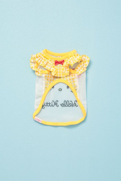 背中には可愛いキティちゃんのフェイスデザインを、どーんとプリント?前身頃はメッシュ生地で、バインダーと同じカラーのチェック柄。胸元にはサテンのリボン付き。そして腕には布帛のチェック柄生地をフリルにして付けました。